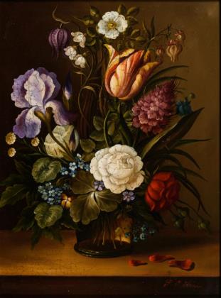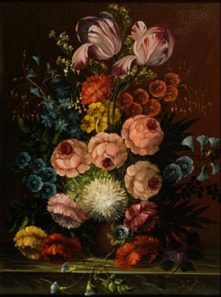 In der Art der Altmeister gemaltes üppiges Bukett mit verschiedenen Blumen in dunkler Vase