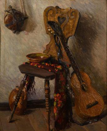 Bauernstuhl mit floral gemustertem Tuch, Schale und Gitarre