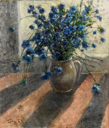 Pastos gemalte Blumen in einer Kanne vor dem Fenster