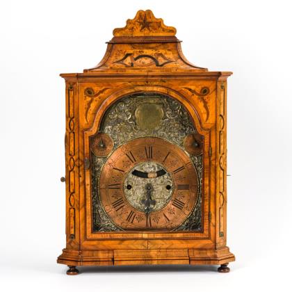 Nussbaum und andere Hölzer furniert. 3-seitig verglastes Gehäuse mit geschrägten Ecken, Rundbogenfeldern, Walmdach mit geschweiftem Giebelfeld und Sternintarsie. Sockel frontseitig mit kleinem Schub, auf 4 gedrückten Kugelfüßen