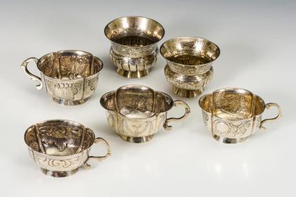 Zwischen Blüten und Insekten mit Schattenmalerei fünf schwarz konturierte Goldkartuschen mit Gitterwerk, darin verschiedene fein gemalte Kauffahrteiszenen. Glatter Goldrand