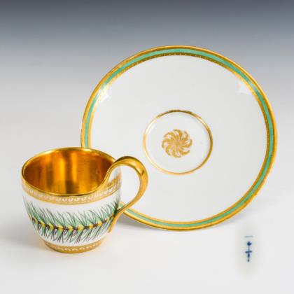 Geometrische Empire-Form mit im Stil der Juwelenmalerei gestalteten Perlbändern. Jeweils in einem Medaillon eine mythologische Darstellung (u.a. Amazonenkampf und verschiedene Herkulesszenen). Kaffeekanne (H 20 cm), Kännchen (H 15,5 cm), Zuckerdose (H 11,5 cm), 3 Zylindertassen (H 6 cm) und 3 Untertassen (Ø 13 cm)