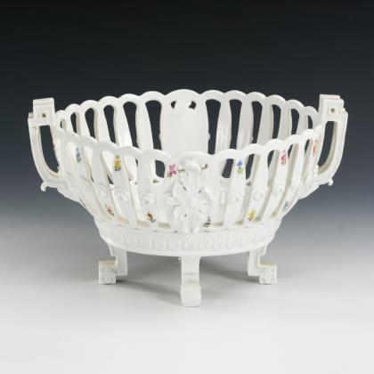 Im Stil des Empire gestalteter Korb mit vier gewinkelten Füßen und zwei gewinkelten Handhaben. Dezente Streublümchenmalerei