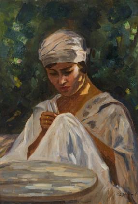 Das künstlerische Schaffen steht im Vordergrund, während die Gesichtszüge verschwommen bleiben. Rückseitig undeutlich bezeichnet. Breiter Profilrahmen