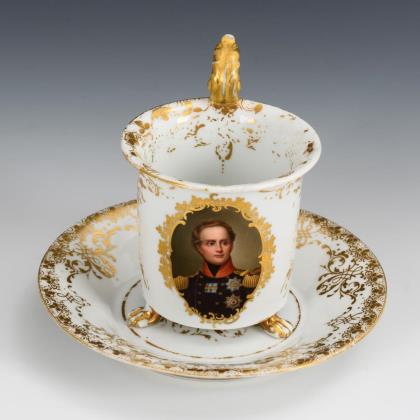 Kratertasse mit Tatzenfüßen und Blatthenkel. Schauseitig ein Medaillon mit dem Bildnis des sächsischen Königs Friedrich August II. (1797-1854), verso reiche ornamentale Goldmalerei