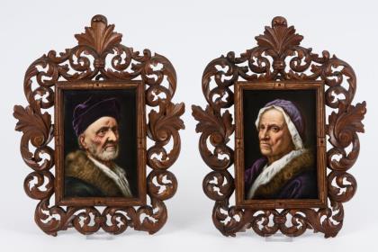 Rechteckige Platten mit der fein gemalten Darstellung einer alten Frau bzw. eines alten Mannes im Pelzmantel, nach Porträtbildern des Malers Balthasar Denner (1685-1749)