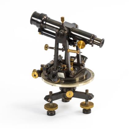 3-beiniger Fuß mit Libelle, Vollkreis, 2 Lupen über Nonien sowie Feinbewegungen. Fernrohr mit Libelle, Objektivkappe sowie Absehe