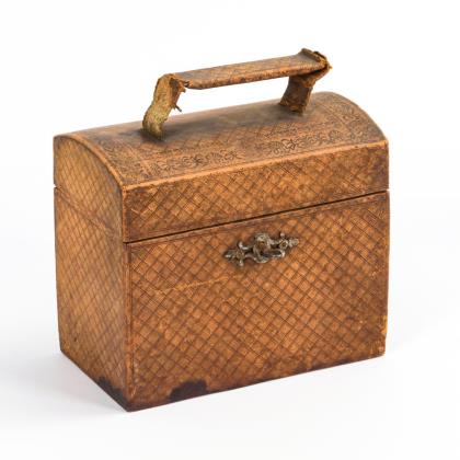 Abschließbare Quadertruhe mit einem Tragegriff auf leicht gewölbtem Scharnierdeckel. Allseits Rautenrapport sowie Anthemion-Rahmung auf dem Deckel. Innen Fachung für 32 Röhrchen. 1 Schlüssel