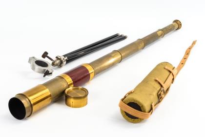 4-zügiges Fernrohr mit Mahagoni, Okularschutz, Objektiv-Schutzkappe und ausziehbarem Blendschutz. Ausziehbares Stativ