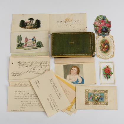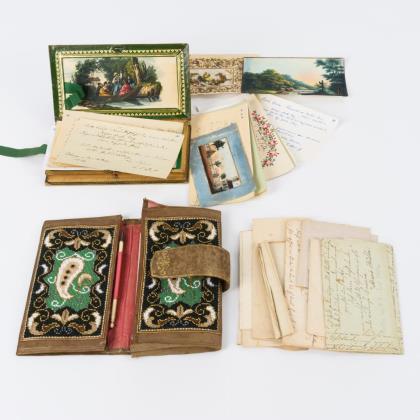 Schatulle mit Stammbuchblättern und Brieftasche mit Briefen und Visitenkarten