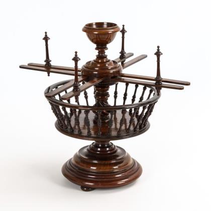 Kunstvoll gedrechselter Ständer mit beschwertem Rundfuß, Korb mit gedrechselten Balustern sowie verstellbare Haspel mit bekrönender Schale