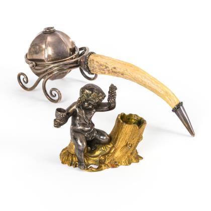 Gerippte Kugelform der Öllampe in kardanischer Aufhängung mit Voluten-Gestell aus Silber sowie Gehörngriff mit silberner Spitze; auf der Wandung Gravur "AR". / Stifthalter in Form eines Baumstumpfes mit montiertem Bacchus als Kind