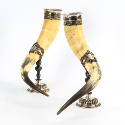 Paar große Trinkhörner mit versilberter Montierung