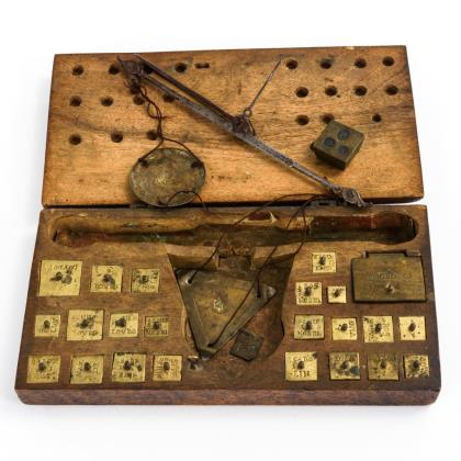 Münzwaage mit Eisen-Balkenwaage, vollständigem Gewichtssatz mit 9 Ausgleichsgewichten (1 ergänzt) sowie 1 beigelegtes Fremdgewicht