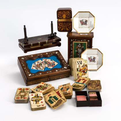 Kartenpresse, Schatulle mit Perlenstickerei und Schlüssel, Zigarrenspender in Schrankform mit Perlenstickerei an der Drehtür, 1 marketierte Holzschachtel für Kartenspiele, 14 Kartenspiele (verschieden gemarkt, darunter 1 Tarockspiel), 2 Porzellanteller mit Kartenmotiven