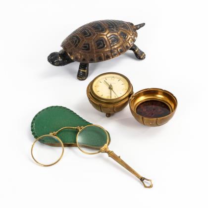 Tischklingel in Form einer Schildkröte (lackiertes Weißblech). Funktioniert. / Reisewecker in Fussballform (Messingblech) "Europa 7 Jewels" gemarkt. Läuft. / Goldfarbenes Lognon im grünen Lederetui