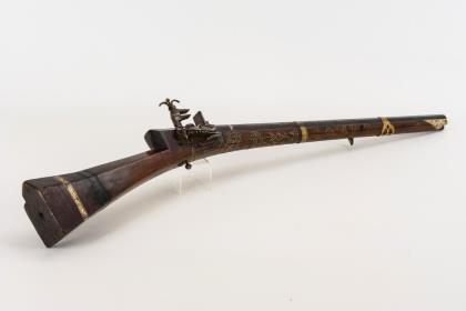 Runder Lauf mit Verzierungen, Kaliber 16 mm. Schön beschnitzter Holzschaft mit verzierten Messing-, Eisen- und Kupferbeschlägen