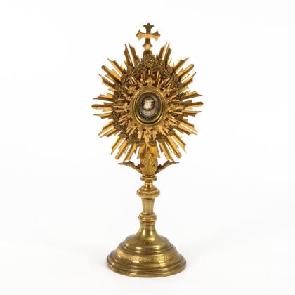 Ähnlich einer Strahlenmonstranz gestaltetes Reliquiar mit verglaster Theca. Auf der Cedula "S. Optati M. Caesaraugust"