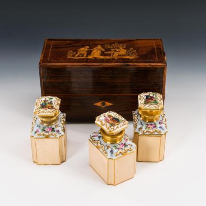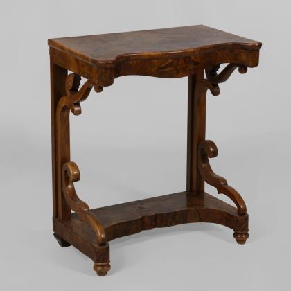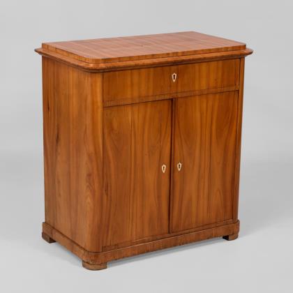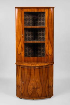 1-türiger, architektonisch gegliederter Korpus mit Sockelschub auf Stollenfüßen. Frontal von zwei Vollsäulen flankiert. Die verglaste Tür mit ornamentaler Verstrebung. Stufig abgesetzter Kopf mit Zahnschnitt-Leiste. Innen 3 feste Böden, stirnseitig mit Ahorn-Fadenintarsien. Der obere Boden im Kopfteil zurückgesetzt. Original Schloss und Schlüssel