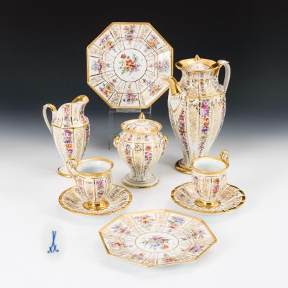 Konische Kanne mit Deckel und Metallhahn, auf dreiseitigem Stövchen mit festem