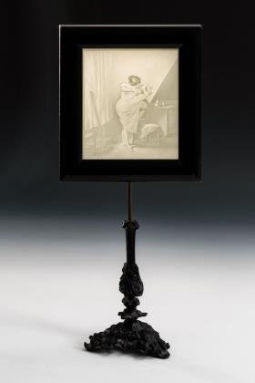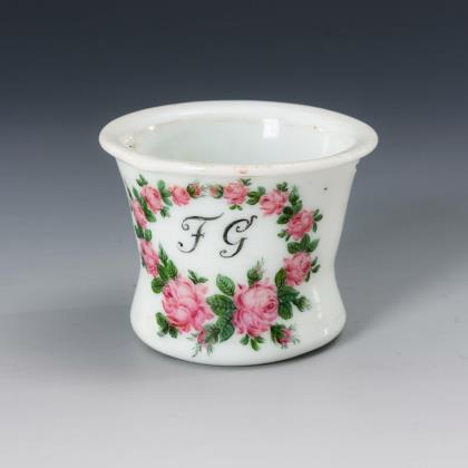 Milchglas, mit Monogramm "FG" in Rosenkranz, verso mit Blütengebinde farbig emailbemalt. Beidseitig simpel eingeschliffene Öffnungen (für Aufhängung am Spinnrad)
