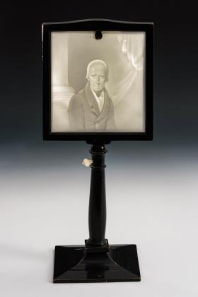 ausgekugeltem Abriss. Schauseitig ein Medaillon mit der mattgeschliffenen