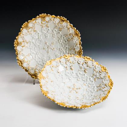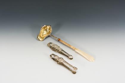 Teilvergoldete Kelle mit Beingriff. Figürlich reliefierte Zuckerzangen