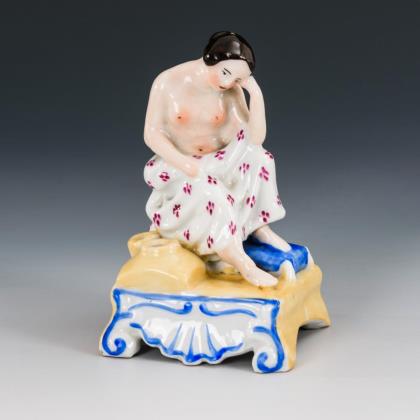 In nachdenklicher Pose sitzende junge Frau mit nacktem Oberkörper, auf rechteckigem Sockel