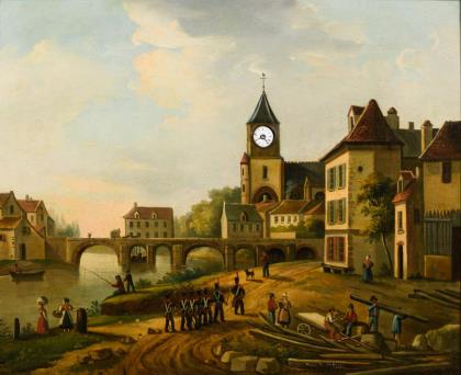 Große Bilderuhr mit Stadtansicht und französischen Artilleriesoldaten