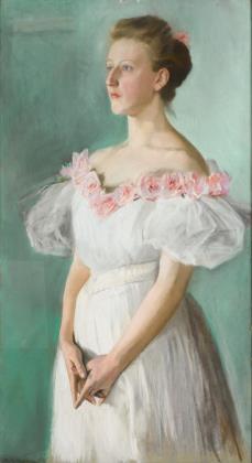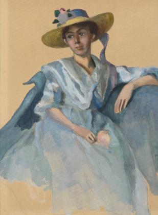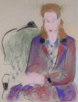 Porträt einer jungen Frau auf einem Armlehnstuhl.
