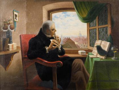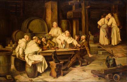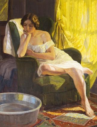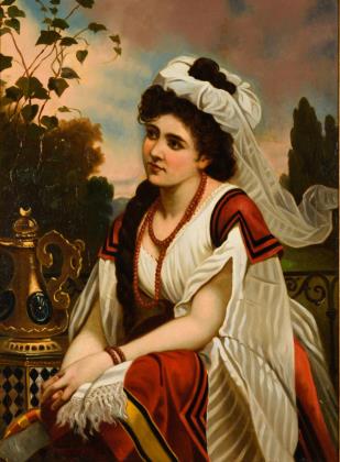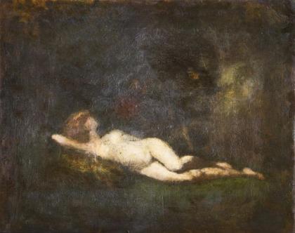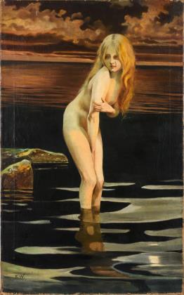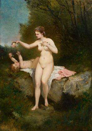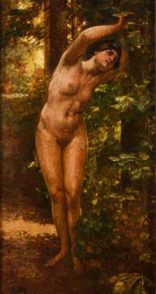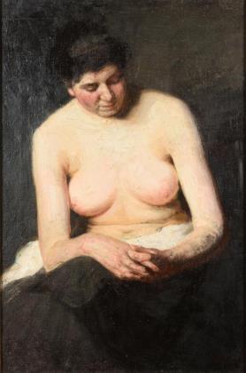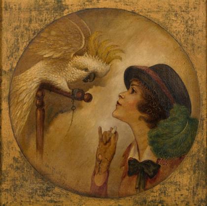 Unterschwellig erotische, anzüglich wirkende Szene. Rückseitig alter Klebezettel: Ständige Kunst-Ausstellung der Münchner Künstler-Genossenschaft im Gebäude des Alten Nationalmuseums, Maximilianstraße. Geschwärzter Rahmen mit Goldleiste