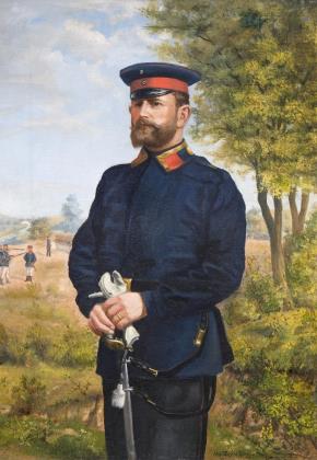 Preußischer Sergeant der Infanterie in der Litewka. Ein Unteroffizier konnte frühestens nach fünfeinhalb Dienstjahren zum Sergeanten befördert werden. Litewka heißt die besondere dunkelblaue Uniform, die er trägt. Originaler Keilrahmen. Profilierter Rahmen schwarz-gold gefasst