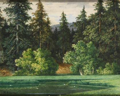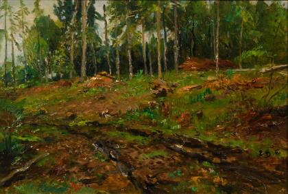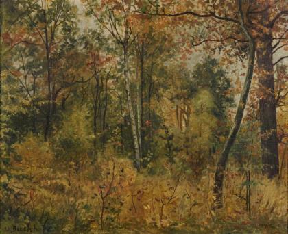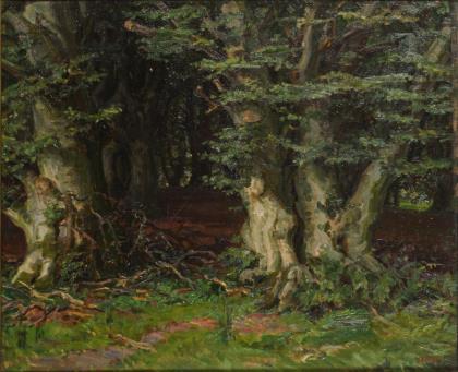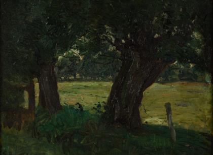 Merker, Max: Waldansicht. Öl/Karton, rechts unten signiert/datiert: 1895. Ansicht eines bewaldeten Hanges mit vereinzelt stehenden Bäumen im hellen Schlaglicht. Retuschiert. 40,5 x 30,5 cm, Goldstuckrahmen 56 x 46 cm.