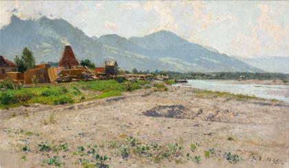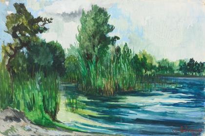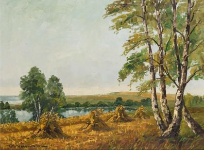 FEDOROVA, Tatyana (*1954 Woronesh) Abend am See Öl/Leinwand. Russland. Rechts unten monogrammiert, verso kyrillisch bezeichnet/betitelt. Datiert: 1987. 80 x 75 cm. Gerahmt: 84 x 80 cm. Fuhrwerk mit Mutter und Kindern im Sonnenschein entlang des Sees. Russische Malerin, besuchte die Kunstschule Buturlinouka sowie die pädagogische Hochschule der Stadt Tscheboksary.