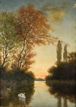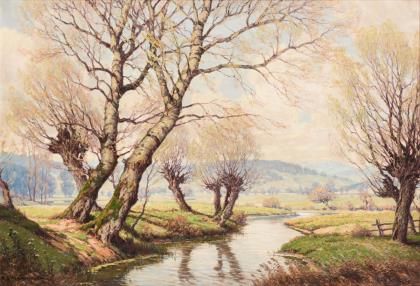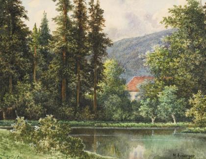ASPERGER, Max (1864 Apolda - 1924 Gotha) Thüringer Landschaft ("Kallenbachteich") Aquarell. Links unten signiert, rechts unten Ortsangabe mit Datum. 23 x 29 cm. Gerahmt & hinter Glas: 37 x 43 cm. Von hohen Bäumen umstandenes Ufer mit Schilf. Landschaftsmaler und Radierer in Weimar und Gotha, studierte in Weimar bei Hagen. Literatur: Thieme/Becker.