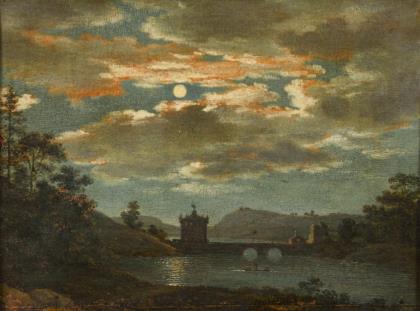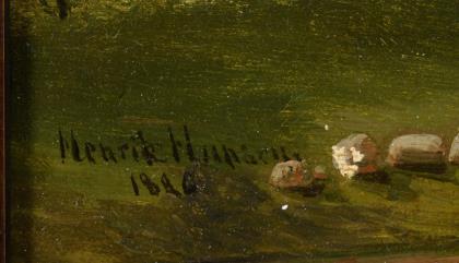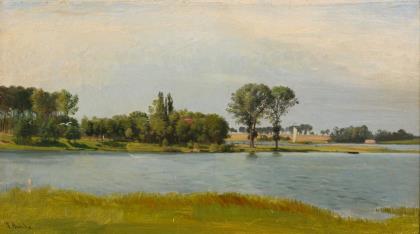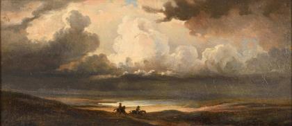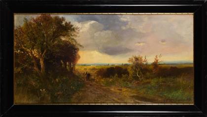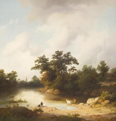 Eine harmonisch abgestimmte, von einer ruhigen Stimmung geprägte Landschaftsformation mit Figurenstaffage. Profilierter Goldrahmen