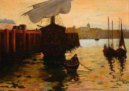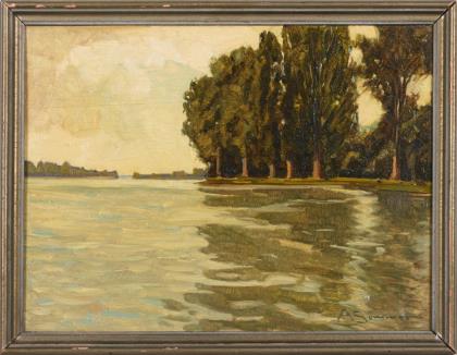 SCHIPPERUS, Pieter Adrianus (1840 Rotterdam - 1929 Den Haag) Niederländische Stadt am Fluss Öl/Leinwand. Rechts unten signiert. 45 x 65 cm. Gerahmt: 63 x 83 cm. Anbei holländische Expertise von 1991. Altersspuren. Holländischer Landschaftsmaler, Autodidakt. Literatur: Thieme/Becker.