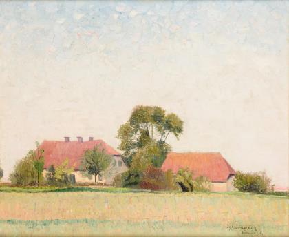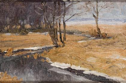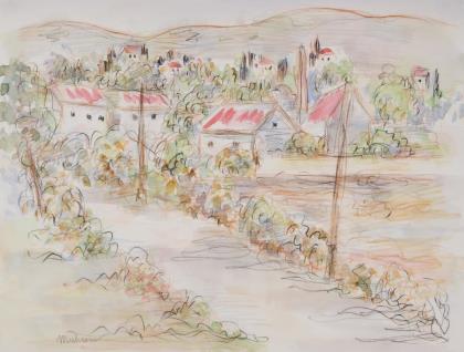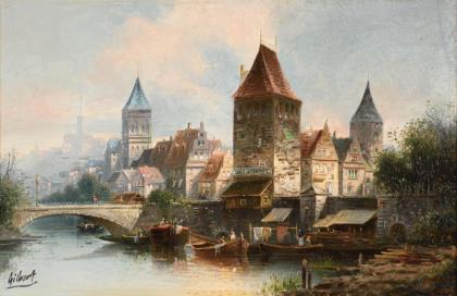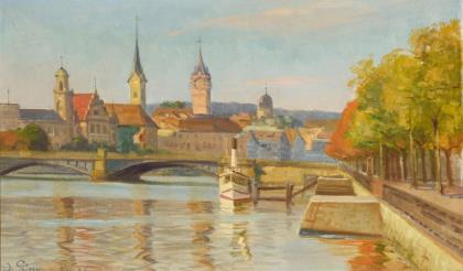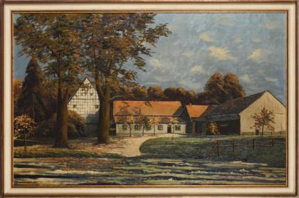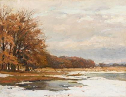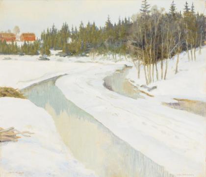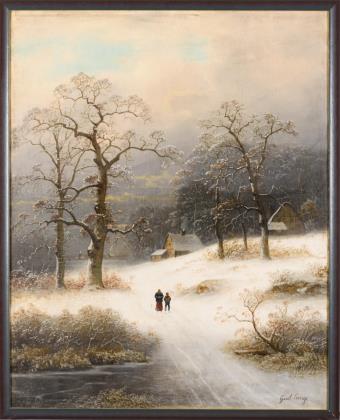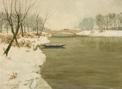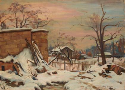 c Öl/Leinwand. Rechts unten monogrammiert. Datiert: 1940. 61 x 90 cm. 68 x 96 cm. Ortschaft mit Brücke an einem sonnigen Wintermorgen. Minimale Altersspuren.