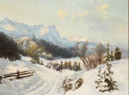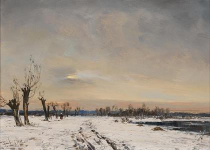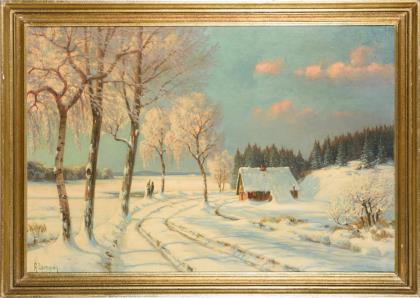 Lyongrün, Arnold: Sonnige Winterlandschaft. Öl/Leinwand, links unten signiert, verso undeutlicher Schriftzug. Eingeschneite kleine Hütte in der weiten flachen Schneelandschaft an einem sonnigen Wintertag. Leichte Altersspuren. 68 x 100 cm, Goldrahmen 80 x 112 cm. & Th/B.: Hamburger Maler (1871 Domnau/Ostpreußen - 1946 Kühlungsborn), studierte an der Academie Julian in Paris, in Königsberg und Breslau. Lehrer an der Kunstgewerbeschule Hamburg. ABB.B 325 Kunde hat geben, das Gebot zu stornieren, ausnahmsweise gemacht. Conny Minimal Retuschen im Himmel rechts, evtl. 5% des Bildes. Leicht krakeliert. Minimal verschmutzt. Interna: Gegend_x