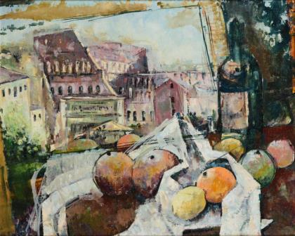 Stillleben mit Weinflasche und Romansicht
