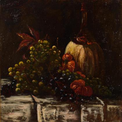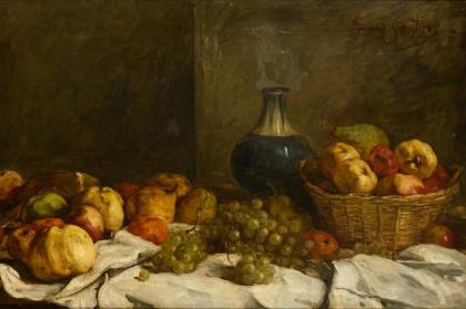GAUTIER, Amand (1825 Lille - 1894 Paris) Stillleben mit Früchten Öl/Leinwand. Frankreich. Rechts oben signiert. 49 x 74 cm. Gerahmt: 66 x 90 cm. Weinflasche neben Trauben, Birnen und Äpfeln auf einem weißen Tuch. Französischer Maler, studierte in Paris.