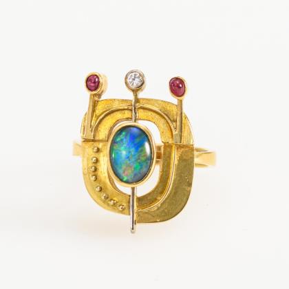 Designer-Ring mit Opaltriplette, Rubinen und Brillant