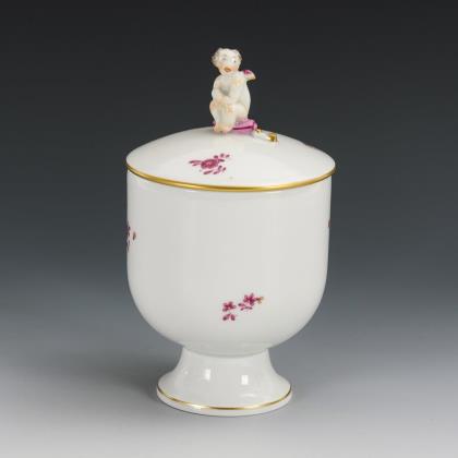 Zylindrische Dose mit Rundfuß sowie Deckel mit einem auf einem Kissen sitzenden Engel als Knauf, purpurfarbene, indianische Streublümchen