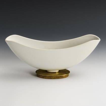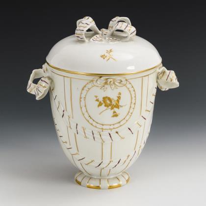 Ovoide Form mit zwei Bandschleifenhenkeln und Deckel mit Schleifenbekrönung. Goldradierte Blütenstängel sowie goldenes und gold-altrosafarbenes Streifenmuster