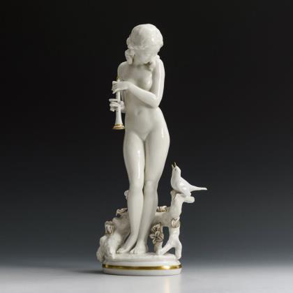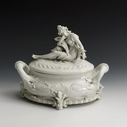 Ovale Terrine mit zwei Handhaben sowie Blatt- und Ährenrelief, auf dem Deckel die plastische Figur einer jungen Frau als Allegorie des Sommers