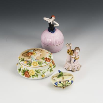 Jugendstil-Dose mit Frauen- und Rosenrelief (Ø 10,5 cm). / Art-déco-Dose in Form einer Dame mit weitem Rock (H 10,5 cm). / Miniaturdose mit Blütenrelief (L 6 cm). / Leuchter für Puppenkerze mit hornblasendem Engel (H 7 cm)