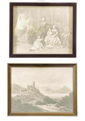 1x die Darstellung einer bergigen Landschaft mit See und Burgruine. / 1x die Darstellung des Königs Georg V. von Hannover im Kreise seiner Familie, nach einem Gemälde von Wilhelm von Kaulbach