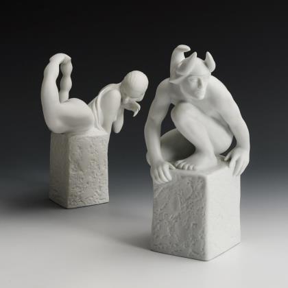 1x Entwurf Christel Marott (1919-1992), 1x Entwurf Pia Langelund (* 1960). Auf einem Quader liegender Frauenakt mit Skorpionschwanz bzw. sitzender Männerakt mit einem Skorpionpanzer als Kopfbedeckung