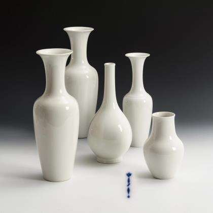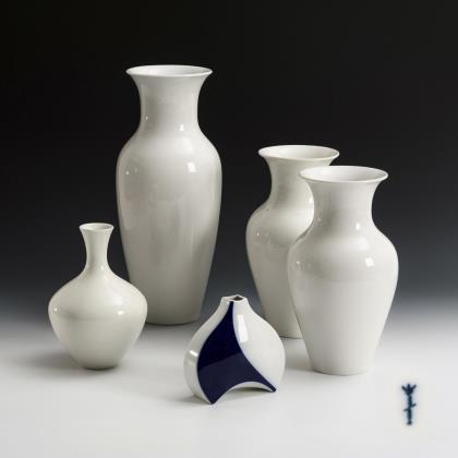 Bodenvase (H 39,5 cm), 2 Balustervasen (H 28,5 cm), 1 bauchige Vase (H 20 cm) und 1 Plattvase (H 13,5 cm)