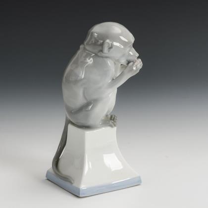 Auf einem Sockel sitzender, eine Frucht essender Affe
